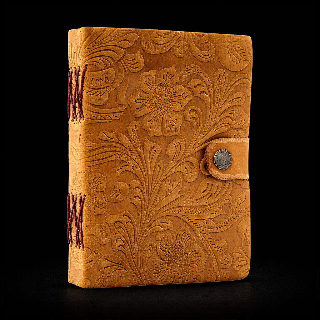 Elegantly embossed with a floral pattern, this tan leather notebook brings craftsmanship and warmth to everyday writing. It’s the perfect balance of rustic charm and practical design, ideal for journaling, sketching, or note-taking.
